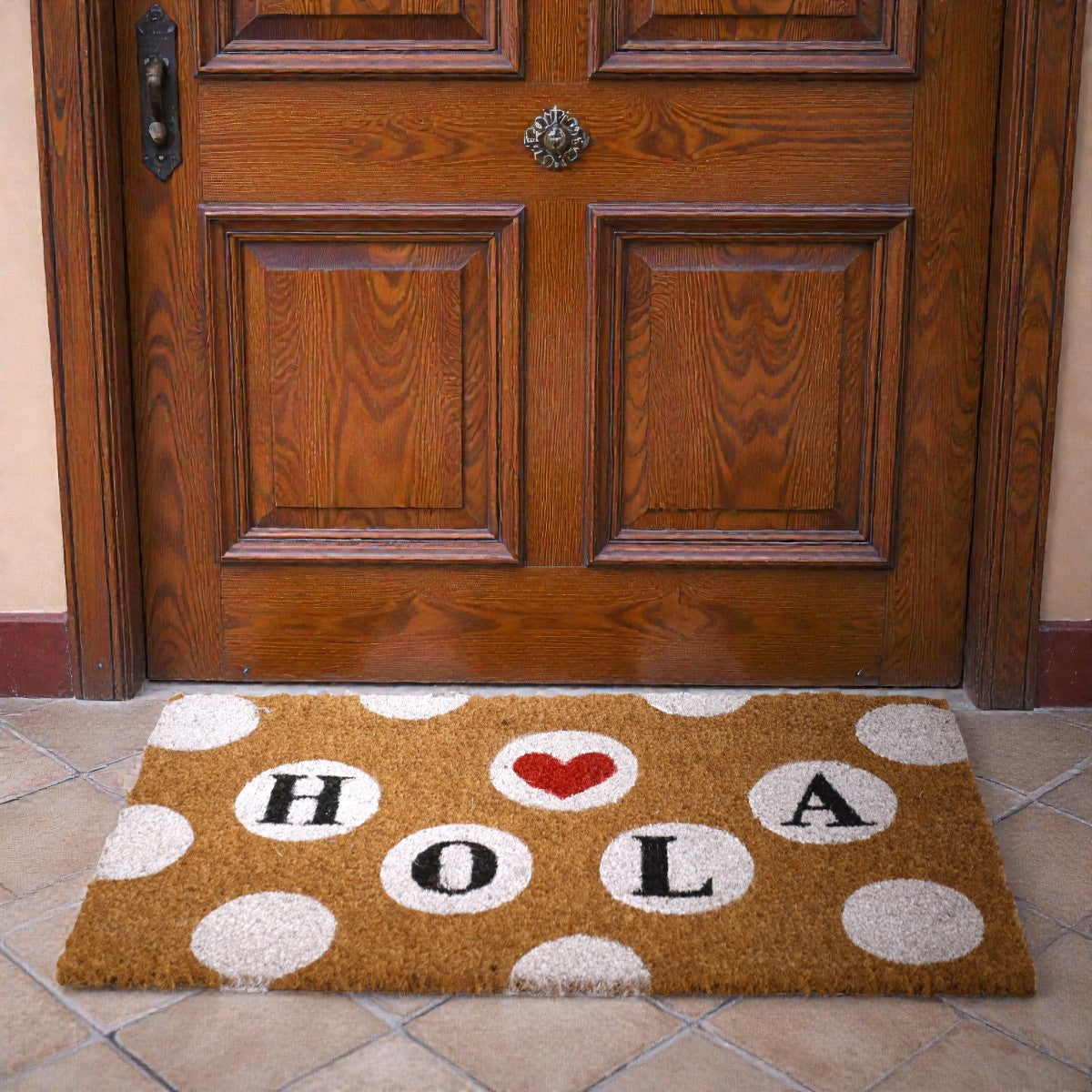 Felpudo de Coco “HOLA ♥” Con corazón y lunares – 70×40 cm – Fibra de coco natural con base antideslizante PVC | Alfombrilla entrada interior/exterior protegido