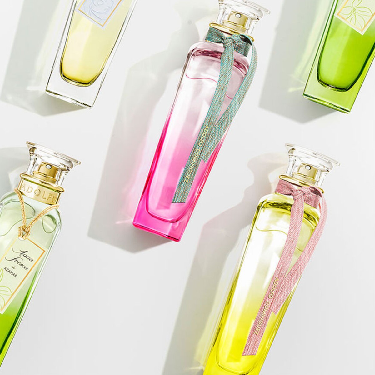 The bottle retains the straight, pure lines of Adolfo Domínguez's Aguas Frescas. A transparent glass bottle tinted in a powerful, feminine pink. At the top, golden touches accompanied by a beautiful aquamarine bow that falls from the neck to add elegance and distinction to the entire bottle.