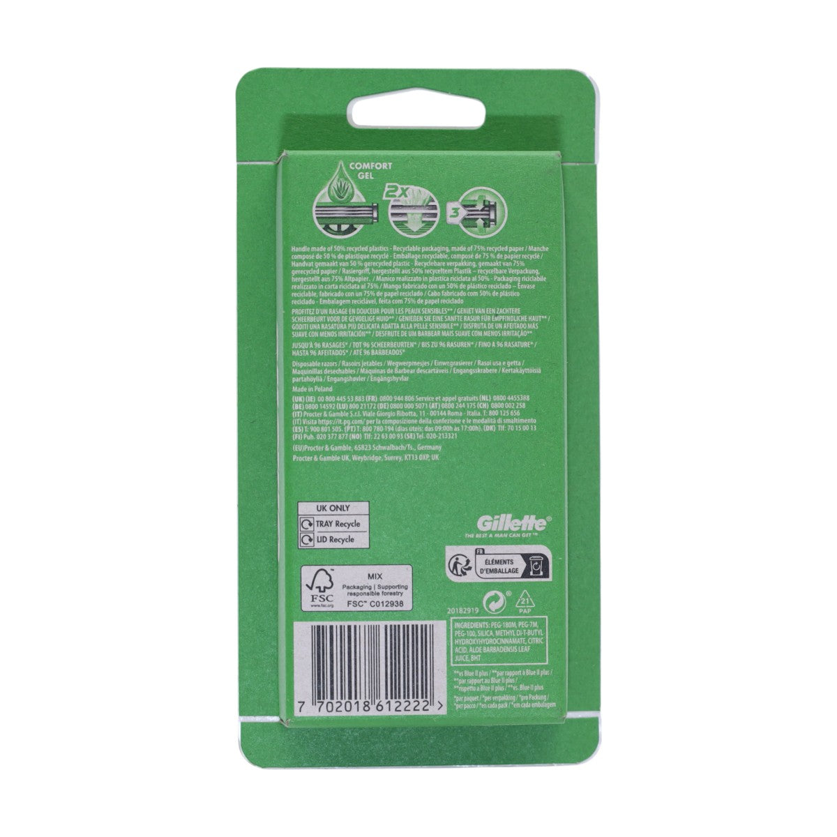 Modo de uso sugerido: mojar la cara, aplicar espuma o gel de afeitar, deslizar la cuchilla en la dirección del vello con movimientos cortos y suaves, aclarar frecuentemente la cuchilla.