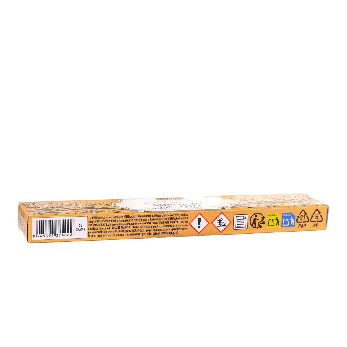 Cada varilla está enrollada a mano siguiendo la tradición masala, mezclando cuidadosamente hierbas, resinas y aceites aromáticos sobre una base de bambú. Este proceso artesanal favorece una combustión uniforme y una liberación gradual del perfume, para que disfrutes de un aroma constante durante todo el tiempo de quemado.