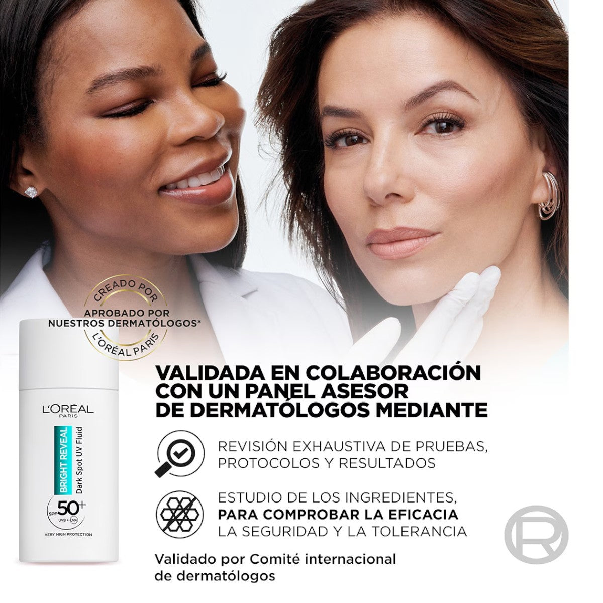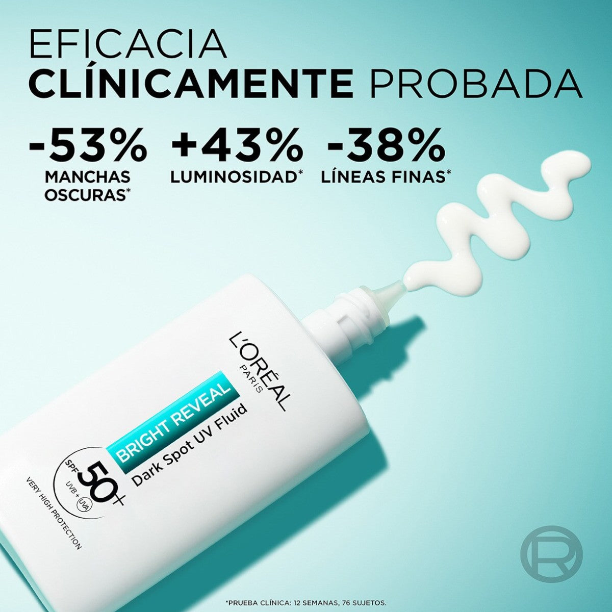 Despierta la luminosidad de tu piel con el Bright Reveal Fluido Hidratante Anti-manchas con Filtro UV SPF50+ y Niacinamida de L'Oréal Paris. Este innovador Fluido diario, de alta protección solar, protege, ayuda a prevenir y corrige visiblemente las manchas. Con su fórmula avanzada con Niacinamida, las manchas oscuras se difuminan visiblemente, transformando tu piel y dejándola con un aspecto más uniforme y joven.