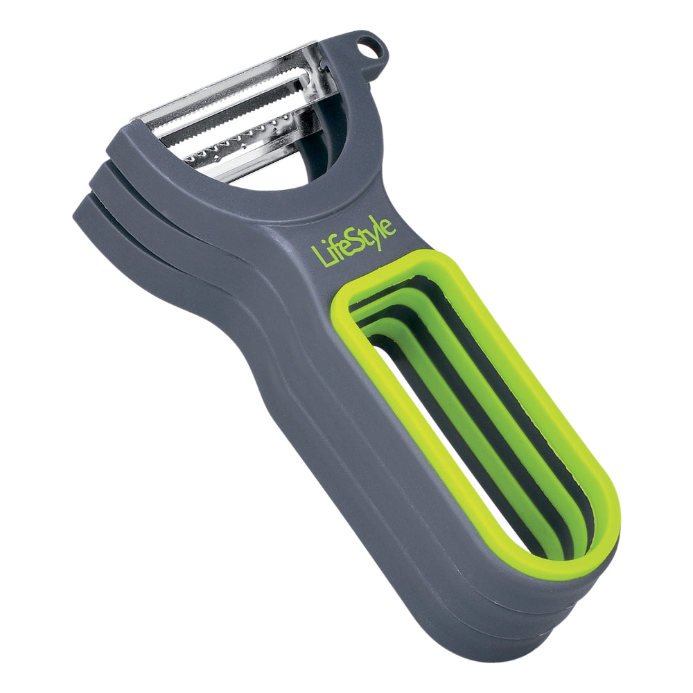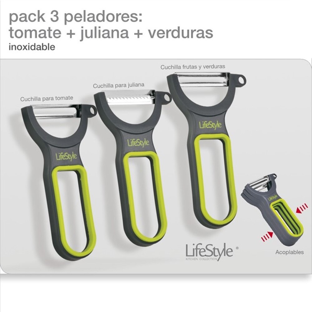 Lote 3 Peladores Verduras Juliana Tomate Pelador de Vegetales Frutas Multifunción 3 Cuchillas de Acero Inoxidable Serrado Rectas y Julienne Color Negro y Verde Herramienta ideal Para su Cocina